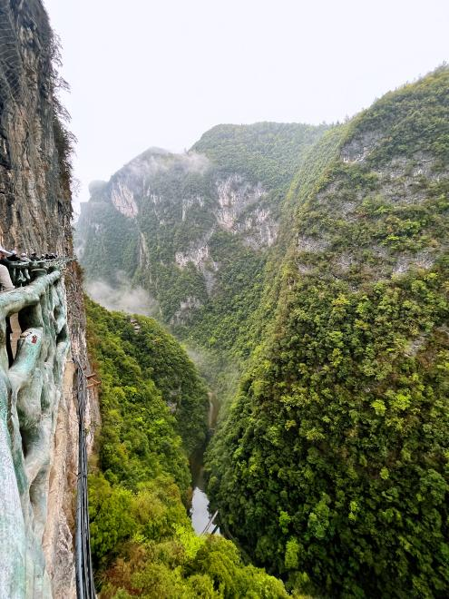 活動(dòng)當(dāng)天,大家乘車約三個(gè)小抵達(dá)屏山大峽谷風(fēng)景區(qū)。步入景區(qū),大家按分組開(kāi)始了登梯爬高、上下行進(jìn)的尋美行程。進(jìn)入檢票長(zhǎng)廊后各個(gè)小組從墨嘎寨入口開(kāi)啟行程,順著巖壁棧道從上而下相繼經(jīng)過(guò)罡步天梯、步云臺(tái)、阿打鋪?zhàn)蛹⒅行?、千尋瀑、浣云橋、蘭索橋等景點(diǎn)后來(lái)到桃花渡碼頭乘游船泛舟觀賞一線天、五尺門等景點(diǎn)后登岸,后繼續(xù)順著山道攀爬至岔溪口觀景臺(tái)、儺愿洞、逍亭,最終到達(dá)杜宇樓結(jié)束全程。一路下來(lái)上千級(jí)的山道臺(tái),所有職工毅力堅(jiān)定,積極克服天氣影響,挑戰(zhàn)身體極限,均按計(jì)劃行程完成活動(dòng)。