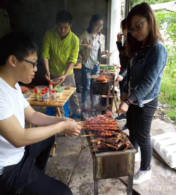 到達(dá)龍洞河之后大家馬上忙碌起來,有的負(fù)責(zé)洗菜,有的負(fù)責(zé)燒火,有的負(fù)責(zé)切菜,歡聲笑語回蕩在龍洞河的上空,原本冷清的人家立馬熱鬧起來。吃過飯菜、燒烤之后大家依然閑不住,因為雨后的龍洞河實在太美,從山間飛流而下的河水就像一條白色的蛟龍飛奔向前,河邊的人家白墻黑瓦,周圍環(huán)繞著綠水青山那情景真有小橋流水人家的愜意。太久沒有親近自然的我們看到這樣的情景就像脫韁的野馬不能自已。我們一起爬山、一起蕩秋千、一起找野菜,累了就回到河邊的人家和他們一起聊天,就這么靜靜地享受眼前的一切。